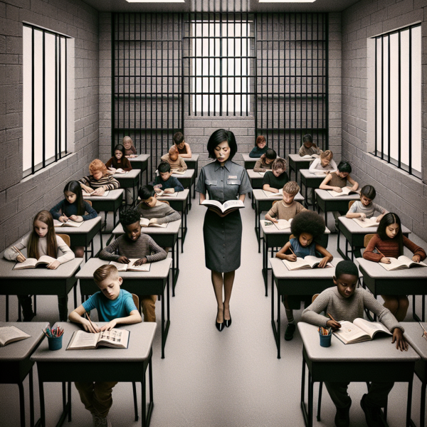 In a world not so far from our own, schools have transformed into prison camps for the young minds of society. The clang of a bell reverberates through the sterile halls, slicing through the air like a blade, commanding attention and obedience. The children, once vibrant and full of imagination, now shuffle through the corridors, their spirits dulled by the relentless structure imposed upon them.